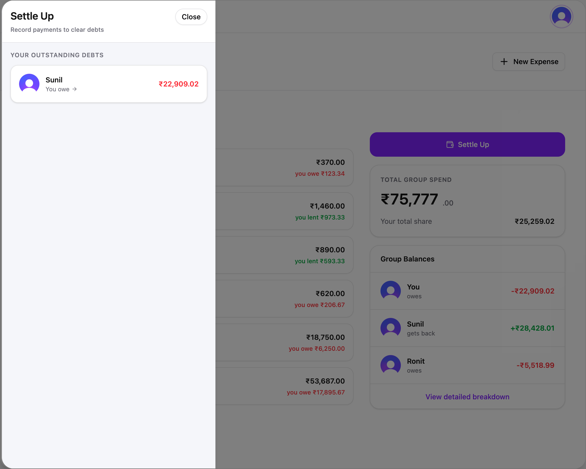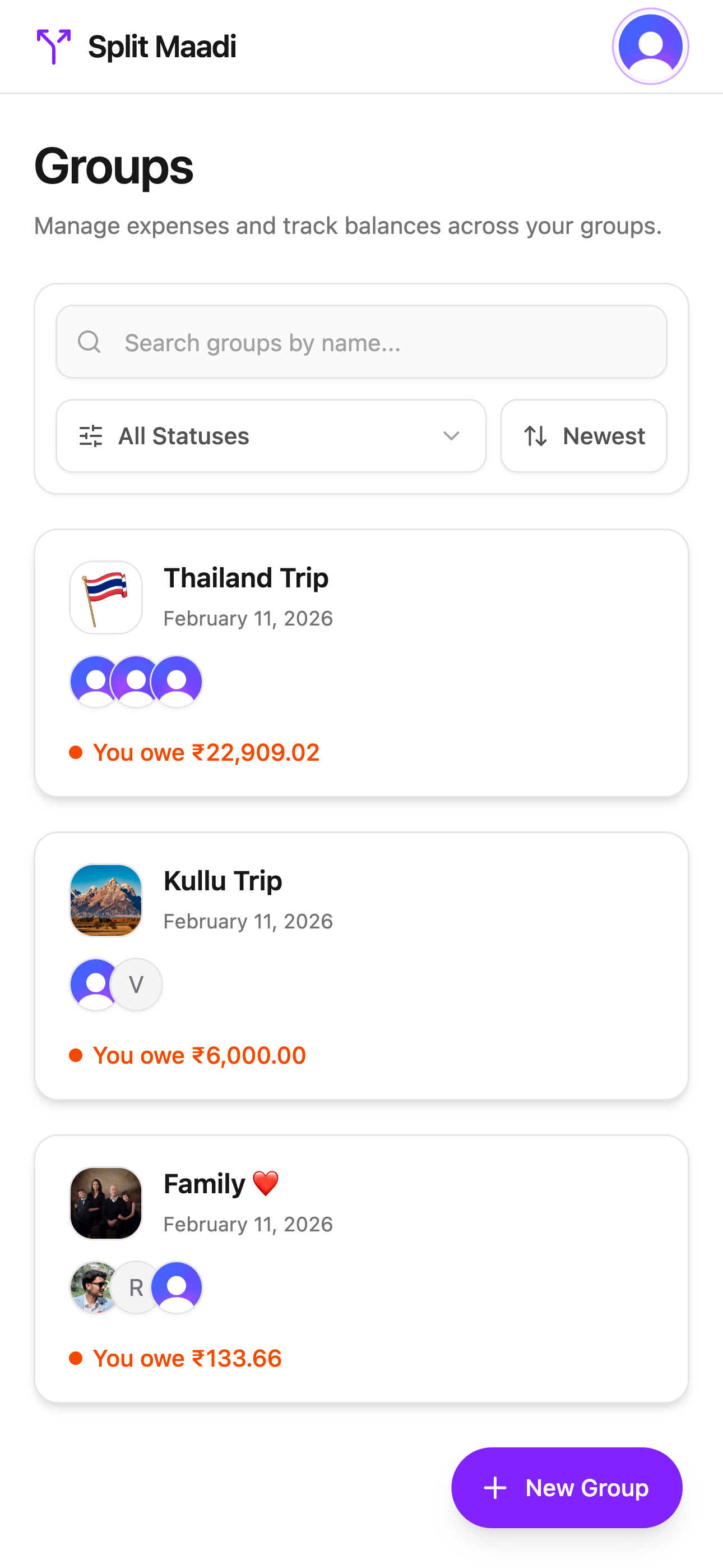 Every group, every balance, one screen. Jump into any group for total spend, member balances, and a complete expense timeline.