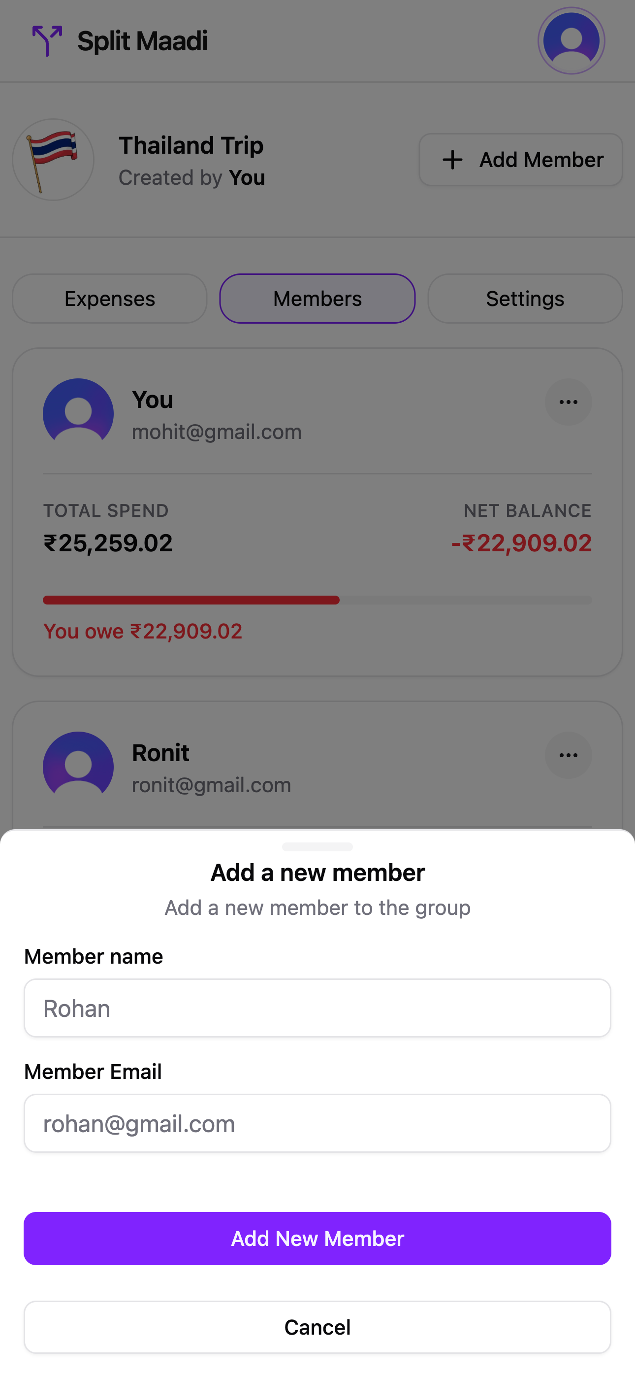 Add members by name and email — they see their balances the moment they join. The full ledger tracks paid, shared, and net amounts for everyone.