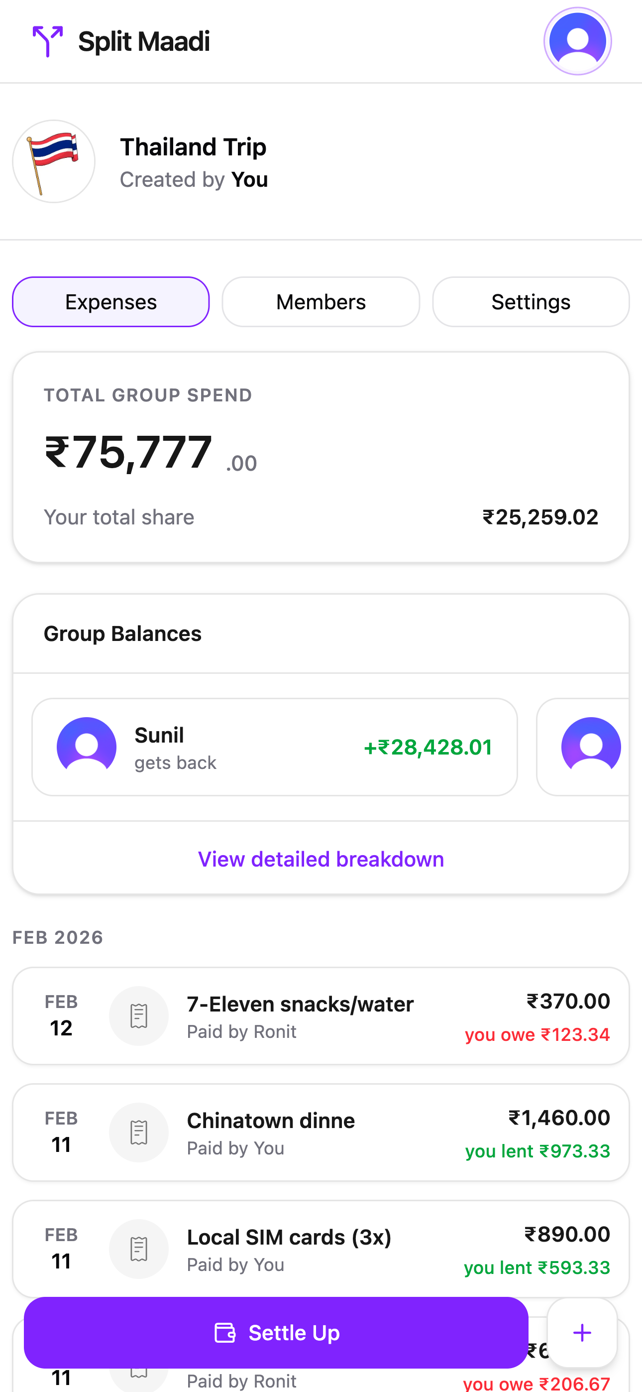 No more "who paid for what?" debates. Every expense shows the full split — who paid, who owes, and who gets back — with receipts and notes attached.
